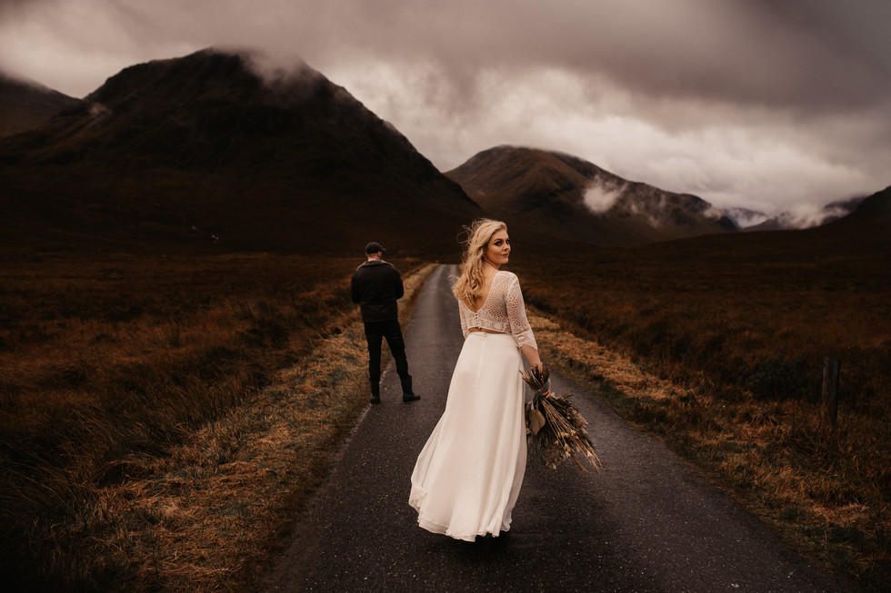 I’ve been dying to shoot in Scottish highlands for a while now so I am so excited to have finally made it a reality. David & I (The Light Painters) got engaged in the highlands so it’s been a place that has always had an element of romance for us. We wanted to create a moody and wild elopement styled shoot in the Scottish highlands so the fact it was torrential rain throughout the entire shoot I guess we did almost ask for it!